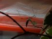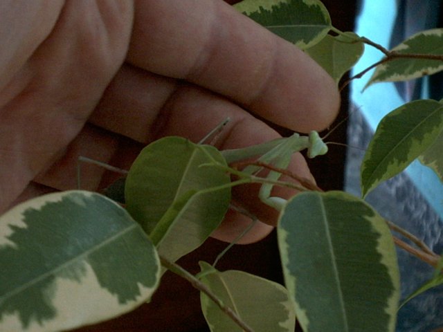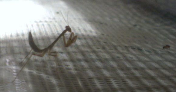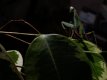 02. Juni: rechts eine Fruchtfliege ca. 2mm groß / Mantide ca. 1,5cm vermutl. L2 oder L3 / kurz nach ihrer Ankunft 31.05.2003 |