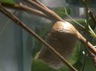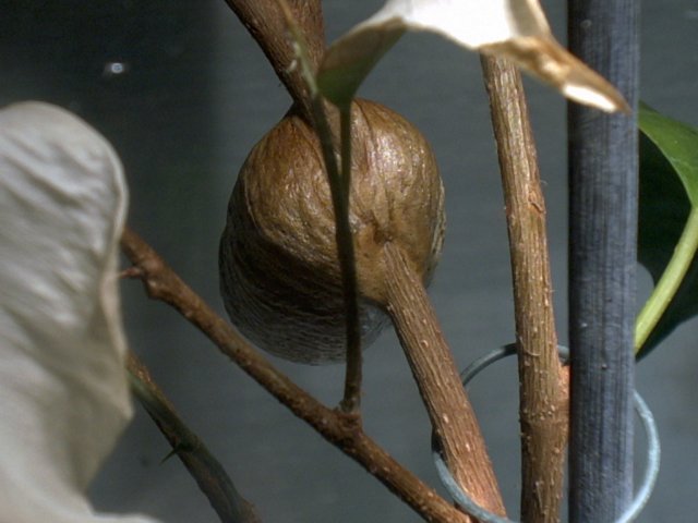 18. September: Schneller als erwartet produziert das Weibchen eine Oothek. Sie war die letzten Tage sehr gefrässig ( täglich eine grosse Wüstenheuschrecke ). Am Schluss dachte ich schon, sie platzt bald, so angeschwollen war ihr Hinterleib. Wenn man sich die Oothek so anschaut, fragt man sich schon, woher dieses kleine Tierchen weiss, wie man so was macht. Inzwischen hab ich das Eierpaket herausgenommen, um es zu "zeitigen". Darunter versteht man die artgerechte Lagerung ( Temperatur / rLF ) in einem separaten Behältnis bis zum Schlupf der Nymphen/Larven. |
