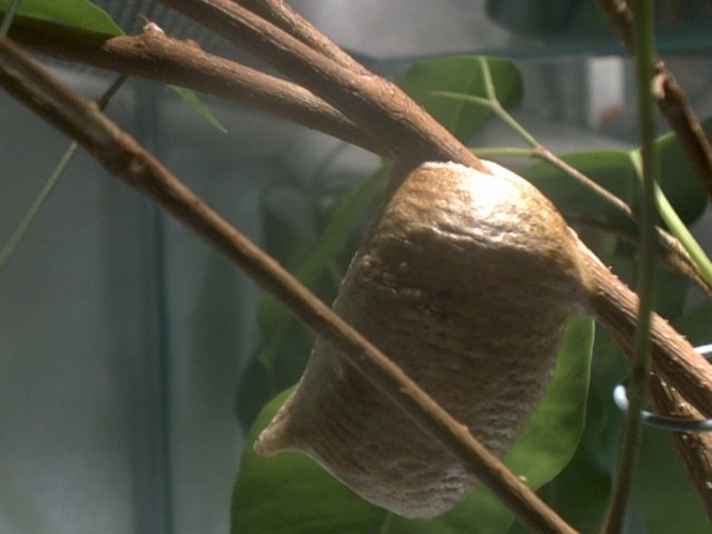 20.September: Die Zeitigung einer Oothek. Der Bodengrund ist Brutsubstrat, sogenannte Vermiculite. Alle 1-2 Tage wird mit einem Zerstäuber der Behälter mit Wasser übersprüht, um die Oothek vor dem Vertrocknen zu bewahren. |
