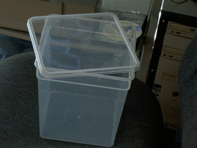Eine Haushaltsbox aus Kunststoff. Muß noch mit Belüftungsöffnungen versehen werden.Grösse ca. 15x15x15cm (BxTxH), daher nur für kleine bis mittlere Arten bzw. Larvenstadien geeignet. Sehr preiswert. Vorsicht mit Strahlern - Kunststoff! |