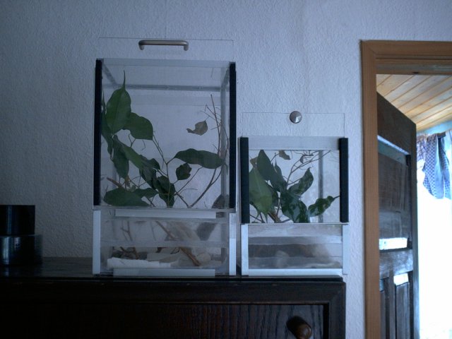 Auch hier gilt: Vorsicht mit Strahlern - Kunststoff! Auf dem Bild links seht ihr drei selbstgebaute Terras für Mantiden: Links 15x15x20cm Mitte 20x20x30cm Rechts 30x30x50cm. Sie sind mit Belüftungsöffnungen versehen ( vorne unten und hinten oben ) und haben eine Falltür vorne. Das rechte hat die richtige Grösse für erwachsene Hierodulas, die kleineren dienten für Larvenstadien der Hierodulas und jetzt für meine Parasphendale. |