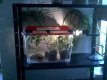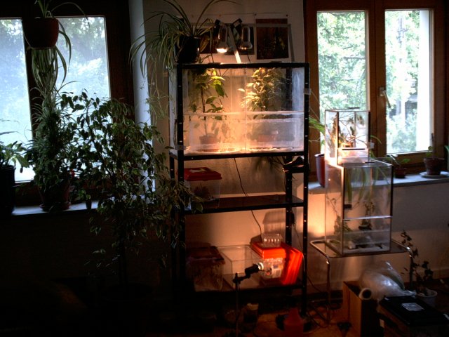 Dann hab ich noch eine Spezialkonstruktion ( war eigentlich das erste, das ich gebaut habe ): in ein altes Blechregal aus dem Baumarkt wurden 2 Terrarien eingebaut ( Gesamtbreite 75cm Tiefe 29cm Höhe 50cm ). Die einzelnen Becken haben somit 37,5 cm x 29cm x 50 cm. In das obere Blech hab ich ein rechteckiges Loch geschnitten, in das ich ein Stück Glas aus einem Schrank eingeklebt habe ( hitzebeständig !). Darüber befindet sich eine Alukonstruktion, an der ich Klemmstrahler befestigen kann. War noch ziemlich laienhaft ausgeführt, erfüllt aber trotzdem seinen Zweck. Mit 2 Strahlern ( 60 W ) erwärme ich bei einer Raumtemperatur von 23 Grad Celsius beide Becken auf über 30 Grad Celsius. Nochmals: Neonlicht vertragen manche Arten gar nicht ( Erblindungsgefahr! Was soviel wie ein Todesurteil ist, da Mantiden vor allem auf Sicht jagen ). Normales Glühlampenlicht oder Halogenlicht vertragen dagegen alle. Es gibt auch spezielle Terrarienlampen, die jedoch nicht gerade billig sind. |